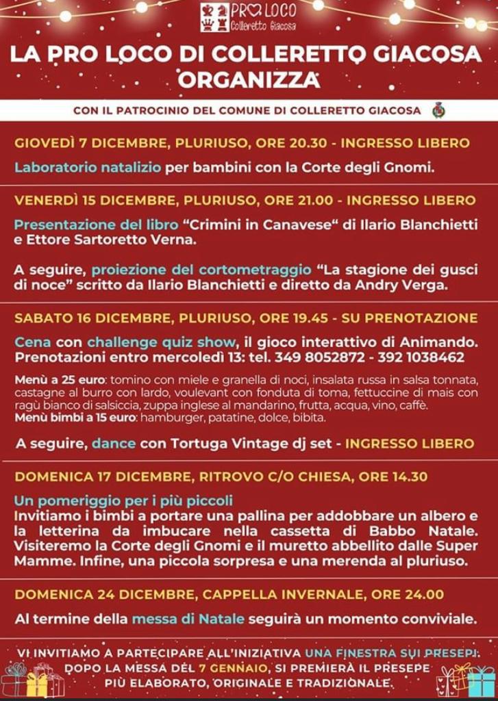 Si allega la locandina con gli eventi organizzati dalla Proloco di Colleretto Giacosa, con il Patrocinio del Comune di Colleretto Giacosa, in occasione del Santo Natale 2023