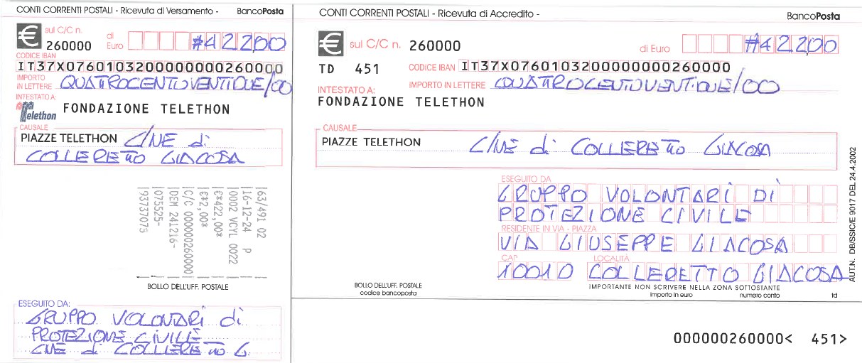 In allegato il bollettino postale con l'importo raccolto e versato pari a 422,00.