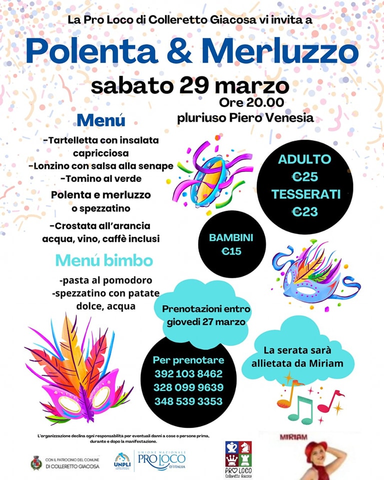 La Pro Loco di Colleretto Giacosa organizza una cena in musica a base di "Polenta e Merluzzo" in occasione del Carnevale 2025