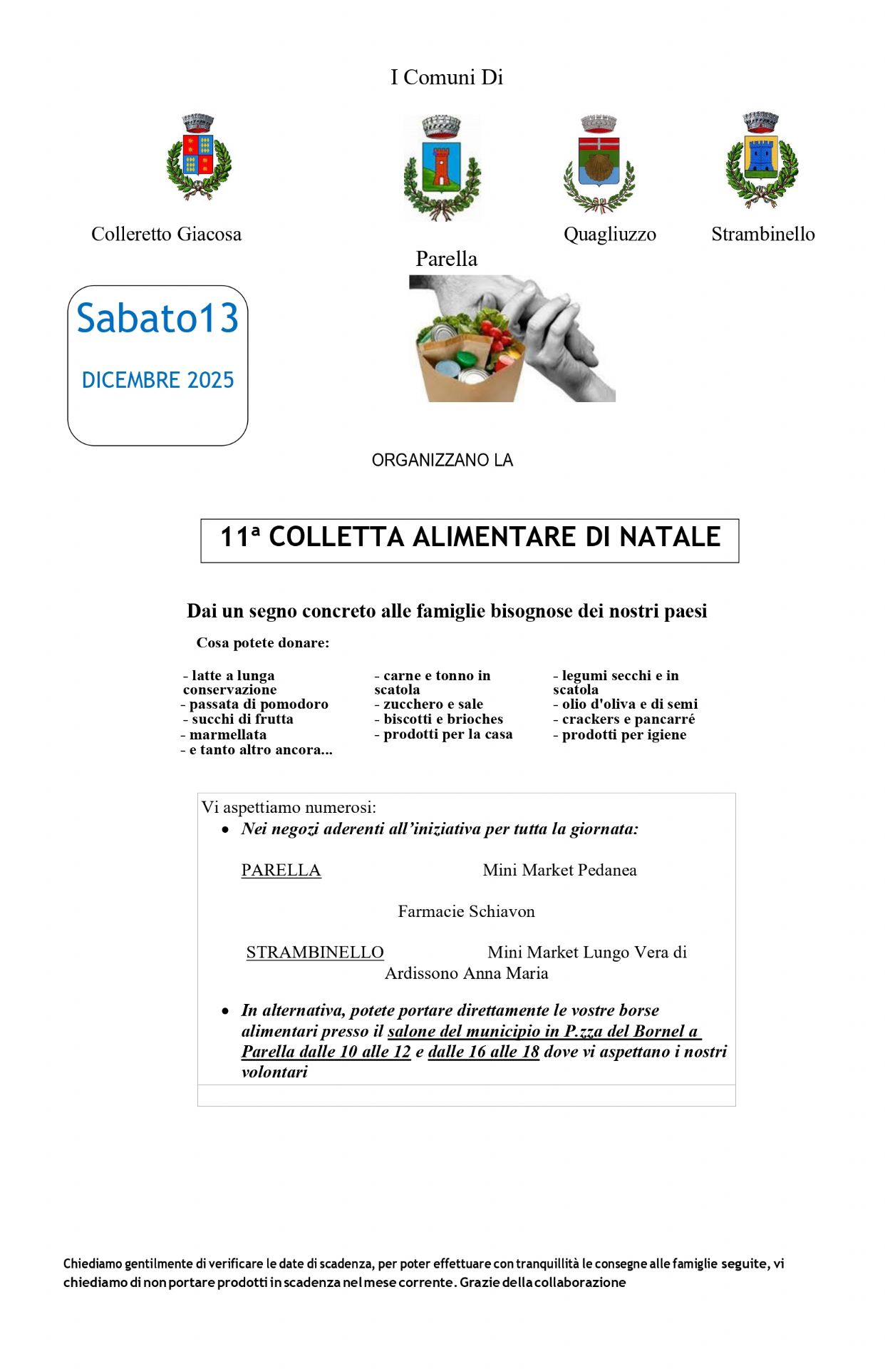 Sabato 11 dicembre 2025 si terrà l'undicesima colletta alimentare di Natale organizzata dai Comuni di Colleretto Giacosa, Parella, Quagliuzzo e Strambinello.