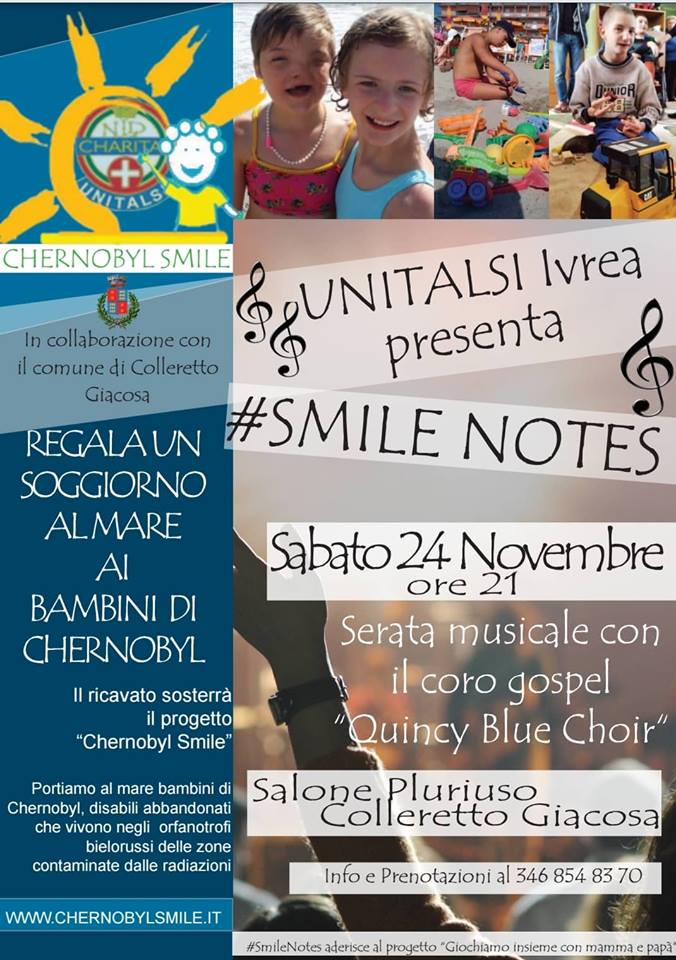Il Comune di Colleretto Giacosa, in collaborazione con l’Associazione UNITALSI Ivrea, organizza il giorno sabato 24 novembre alle ore 21:00 presso il Salone Polifunzionale “Piero Venesia”, una serata musicale “ Smile notes” con la partecipazione del coro gospel “Quincy Blue Choir”. Il ricavato andrà a sostegno del progetto “Chernobyl Smile”.