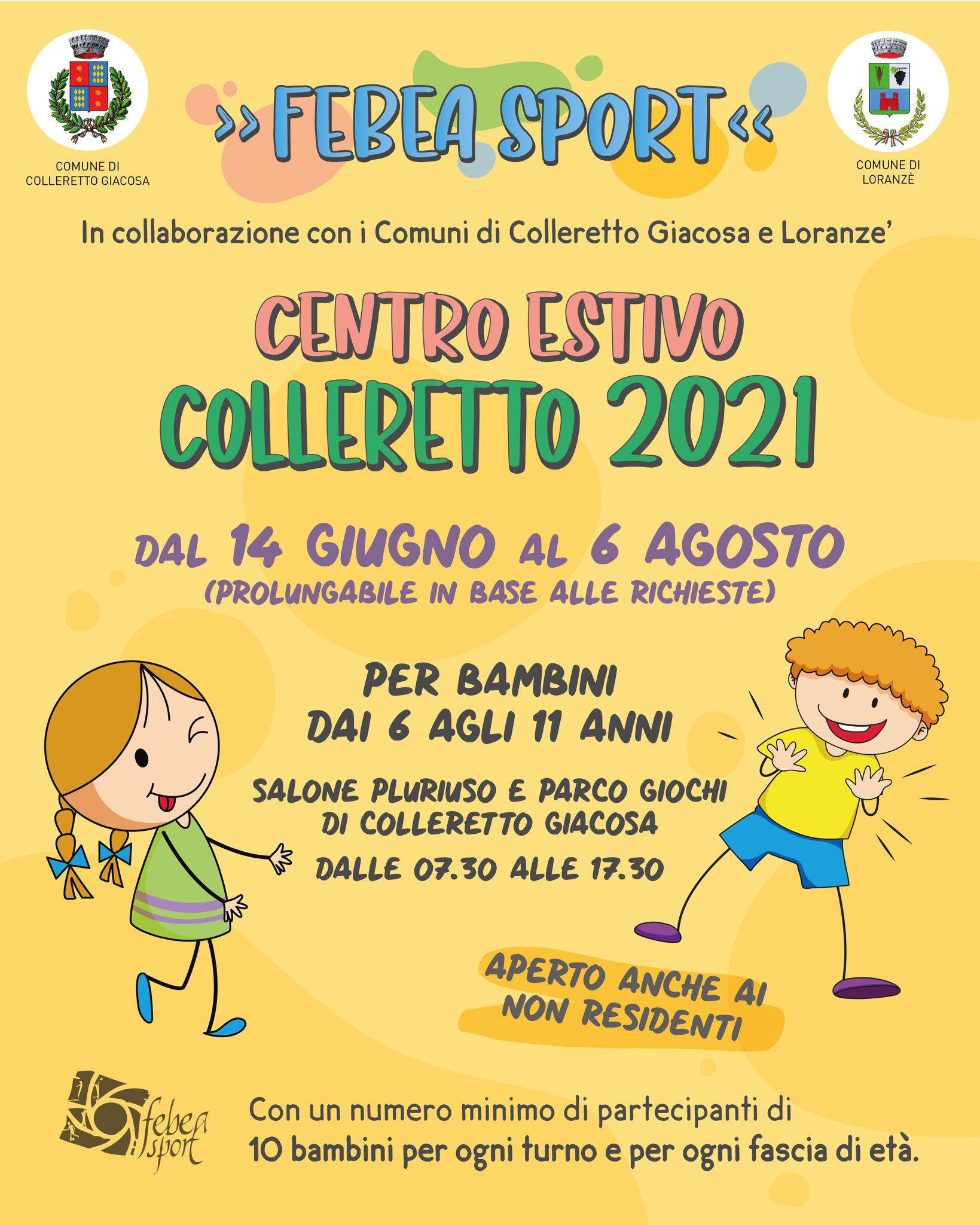 Il Comune di Colleretto Giacosa insieme al Comune di Loranzè, in collaborazione con l'Associazione FEBEA SPORT s.n.c. di Banchette, organizza dal 14 giugno al 6 agosto 2021 (con possibilità di prolungamento) il CENTRO ESTIVO 2021 per bambini dai 6 agli 11 anni, presso il Salone "Piero Venesia" ed il Parco "Guido Rossa" a Colleretto Giacosa dalle 07:30 alle 17:30, aperto anche a bambini non residenti.
