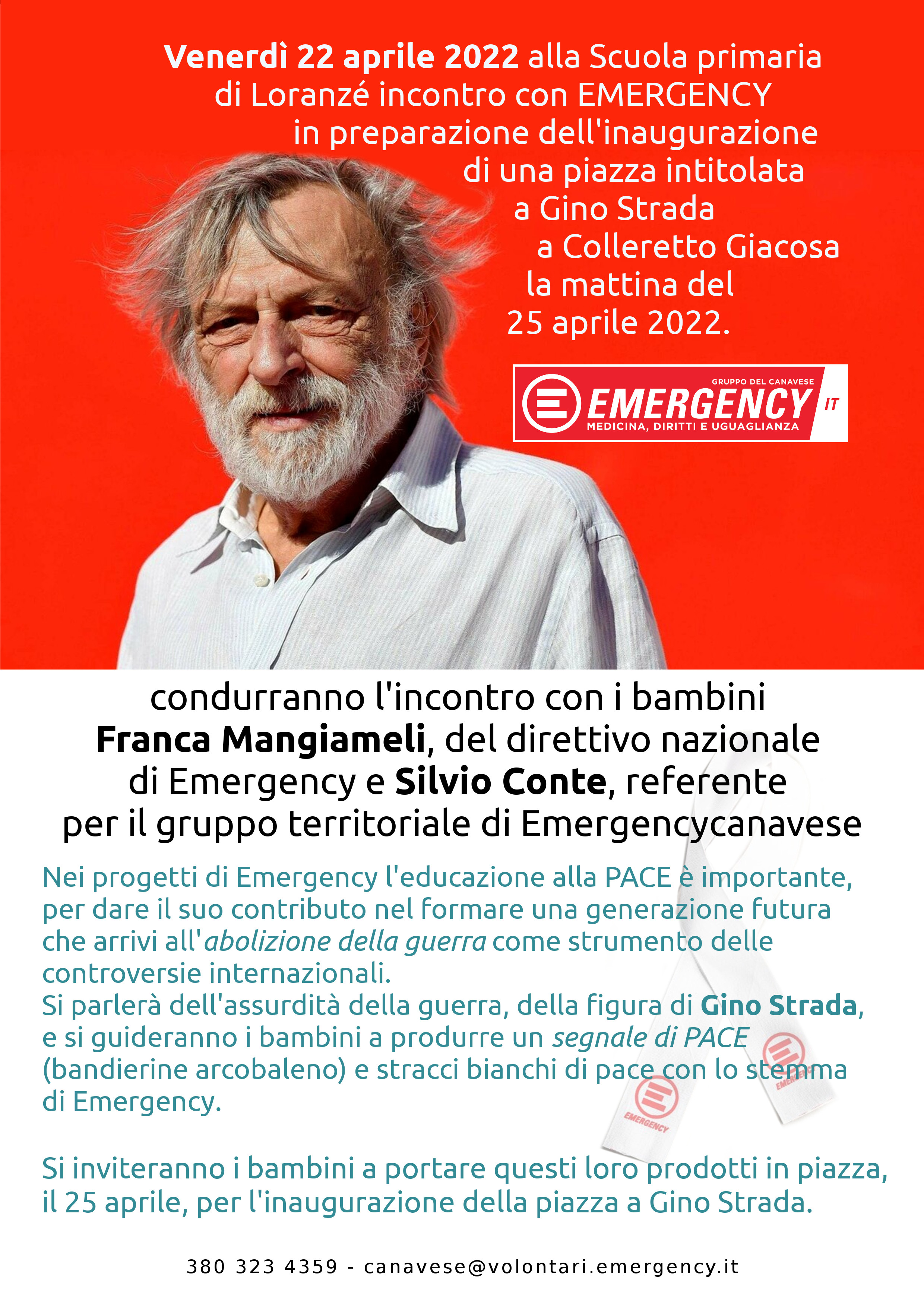 venerdì 22 aprile 2022 alle 14.15 presso la Scuola primaria di Loranzé un incontro all'aperto con EMERGENCY, in preparazione dell'inaugurazione di una Piazza intitolata a Gino Strada a Colleretto Giacosa, che si terrà alle 11:30 del 25 aprile 2022.