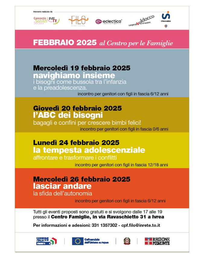 Al Centro per le Famiglie F.I.L.O. di Ivrea prendono avvio nuovi incontri rivolti a genitori con figli in diverse fasce d'età: 0-6 anni, 6-12 anni; 12-18 anni.