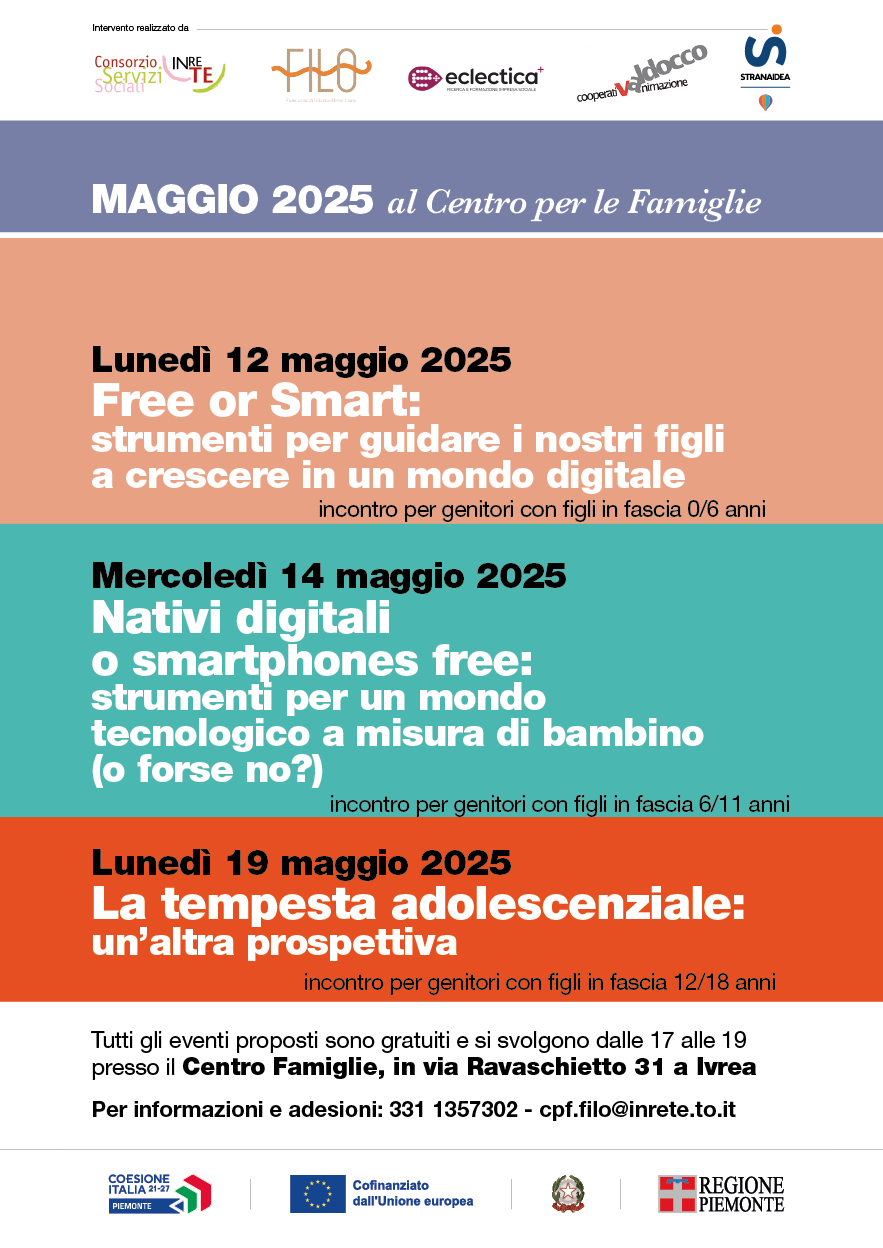 Al Centro per le Famiglie F.I.L.O. di Ivrea continuano gli incontri rivolti a genitori con figli in diverse fasce d'età: 0-6 anni, 6-12 anni; 12-18 anni.