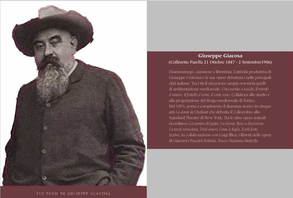 Giuseppe Giacosa, commediografo e librettista delle parole delle opere La Bohème, Tosca e Madama Butterfly, musicate da Puccini, è uno straordinario e poliedrico personaggio la cui biografia merita d’essere conosciuta. La sua casa, “La Grande Arca”, qui a Colleretto Giacosa, divenne luogo di ritrovo e richiamo degli illustri comprimari di un cenacolo culturale di personalità come Eleonora Duse, Toscanini, De Alici, Carducci, Boito che ha come regista e attore protagonista questo illustre canavesano.