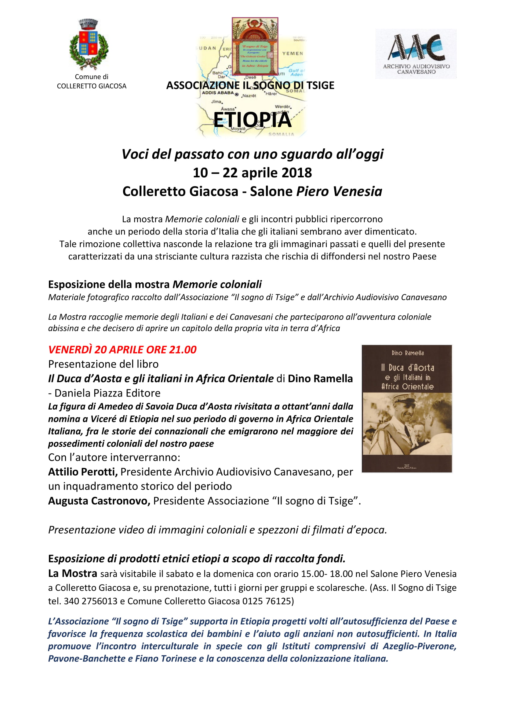 Venerdì 20 aprile alle ore 21:00 presso il Salone Piero Venesia presentazione del libro "Il Duca d'Aosta e gli italiani in Africa Orientale" di Dino Ramella