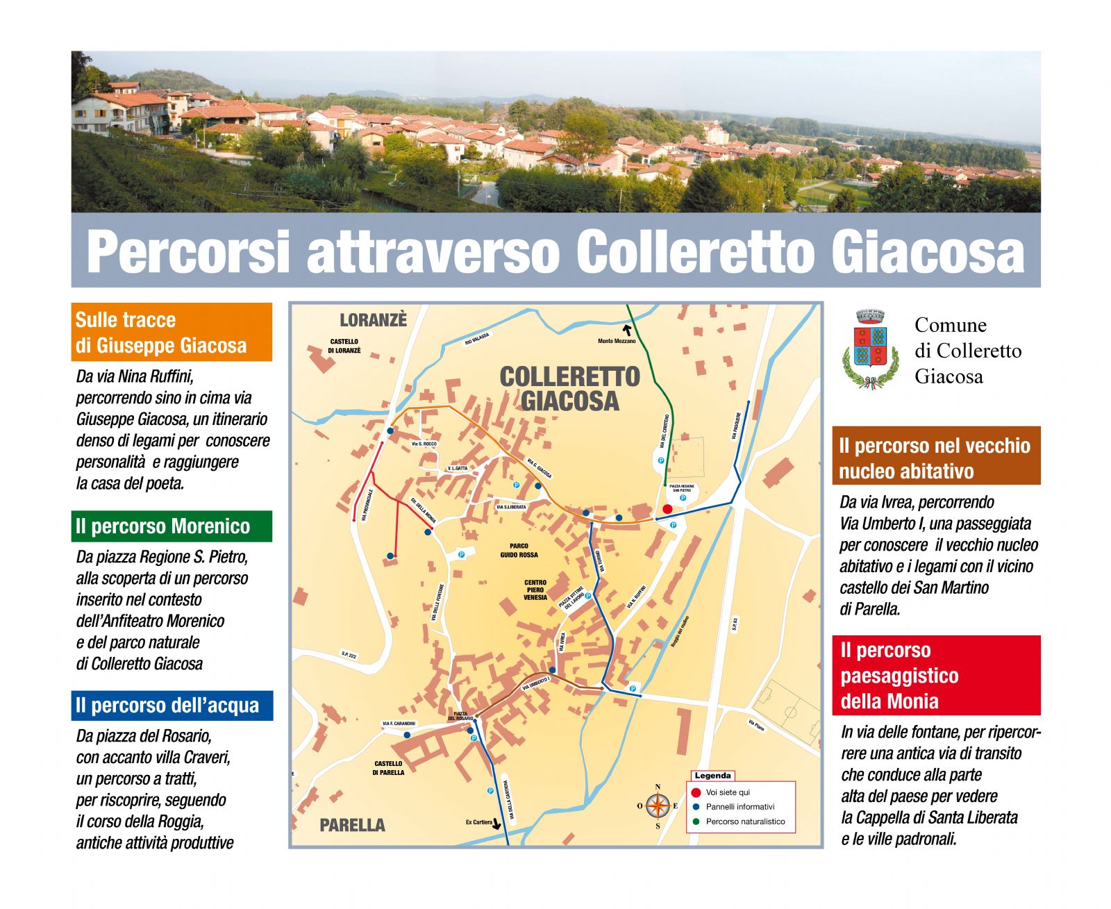 Un pannello riepilogativo introduce i visitatori al paese e illustra i "Percorsi attraverso Colleretto", ciascuno rappresentato da un proprio colore e identificativo di uno specifico tema.